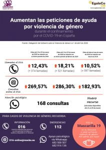 Desde La Federación de Organizaciones de Mujeres de Lorca y la Consultora de género Egaleco Lab hemos visto en la necesidad de explicar con datos la realidad de estas mujeres durante estos días. Según los datos proporcionados por la Delegación de Gobierno para la Violencia de Género, el 016 ha recibido 374 llamadas más entre el 14 y el 29 de marzo de 2020, lo que supone un incremento del 12,43% comparado con el mismo periodo de 2019. En relación con el mismo periodo de febrero de 2020, se han producido 521 llamadas más (+18,21%), y, si se compara con el mismo mes en 2019, este aumento supone un 10,52% (597 llamadas más). Por lo tanto, con independencia del periodo de referencia con el que se compare, se confirma el incremento de las llamadas al 016 durante en lo que llevamos de Estado de Alarma. Asimismo, cabe destacar el aumento exponencial de las consultas online del mismo servicio: el ascenso fue del 286,30% entre el 14 y el 29 de marzo con respecto al mismo periodo del mes anterior (febrero 2020), lo que puede estar relacionado con el riesgo que puede tener para la víctima realizar una llamada de estas características en una situación de confinamiento. No olvidemos que, desde que se comenzó a recoger datos, es decir, desde 2003, 1.051 mujeres han sido asesinadas por sus parejas o exparejas, 18 en lo que llevamos de año y 2 durante el confinamiento.